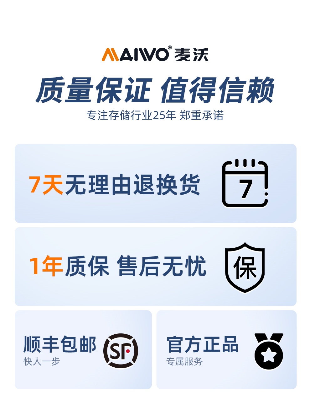 MAIWO(麦沃)致力于为用户提供更好的科技产品。麦沃产品以“享受数码生活”为设计理念,打造简便、易用、高速的产品,为消费者在使用数码产品时带来更好体验。MAIWO为广大消费者提供苹果电脑外围配件产品、电脑周边产品、智能手机周边产品、移动存储周边产品。其产品线包括磁盘阵列柜、NAS网络硬盘组、移动硬盘盒、硬盘播放器、硬盘拷贝机、加密系列移动硬盘、易驱线、电脑板卡(加速卡、阵列卡)、固态硬盘、USB HUB、USB周边产品等。MAIWO为家庭用户、个人用户、数码摄影人、企业数据管理、影视广告制作公司等提供产品和服务。产品通过严苛质量检测拥有多项产品荣誉检测认证书:如CCC、CE、FCC、EK、ROHS、PSE、SG、CB、CSA等