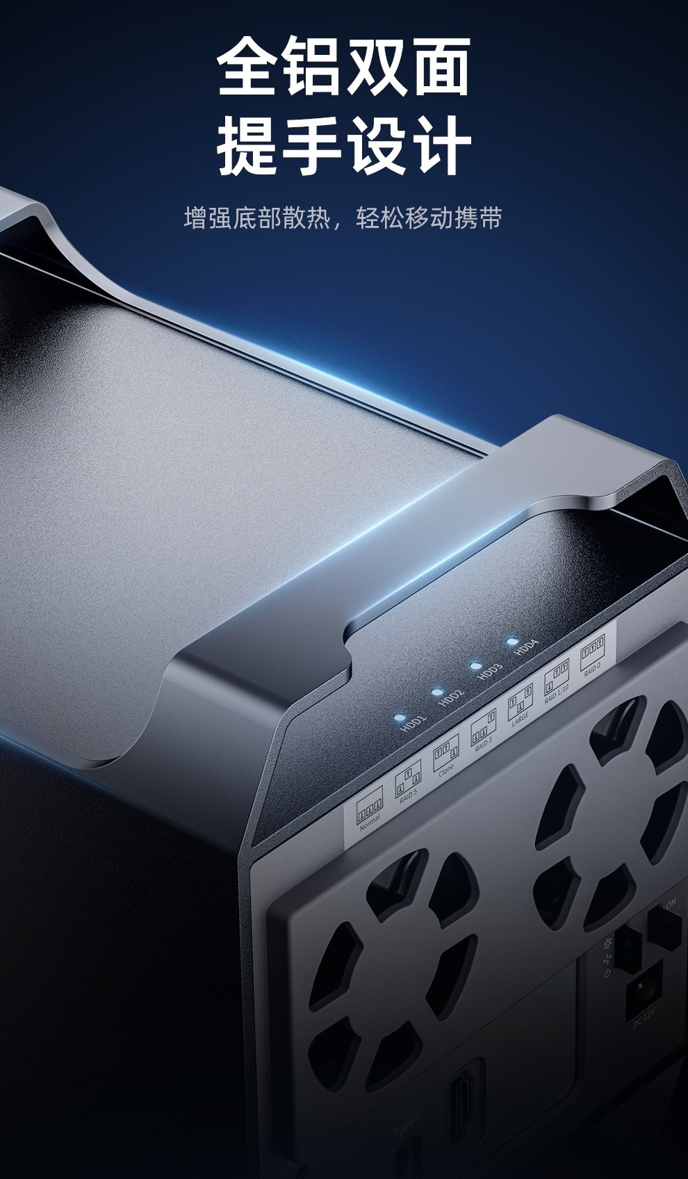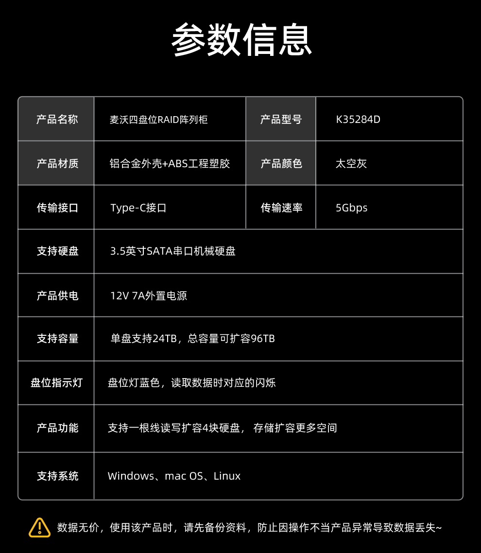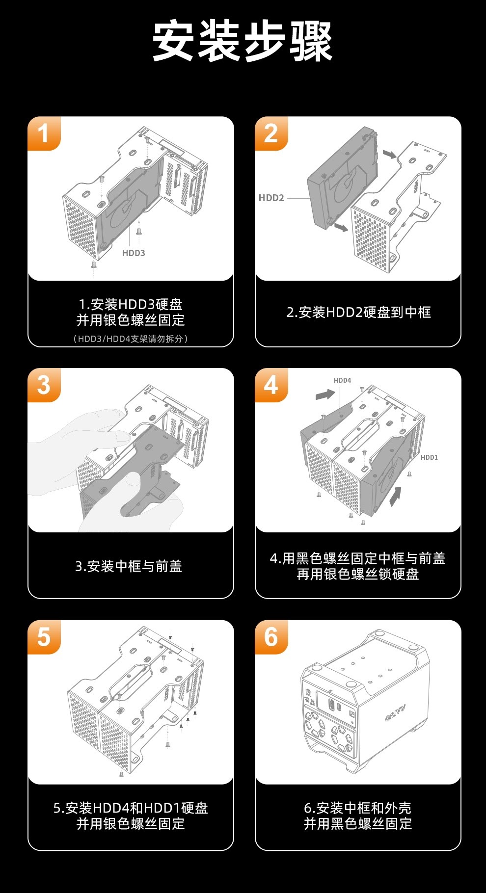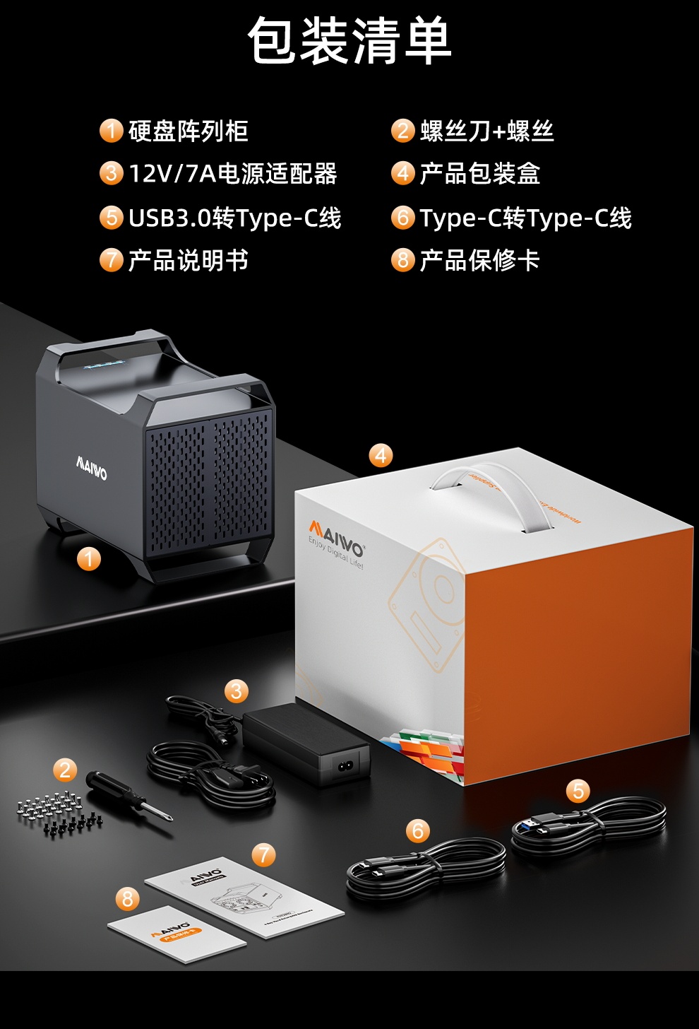 包装清单:四盘位硬盘阵列柜*1,螺丝刀*1+螺丝,12V/7A电源适配器*1,产品包装盒*1,USB3.0转Type-C线*1,Type-C转Type-C线*1,产品说明书*1,产品保修卡*1