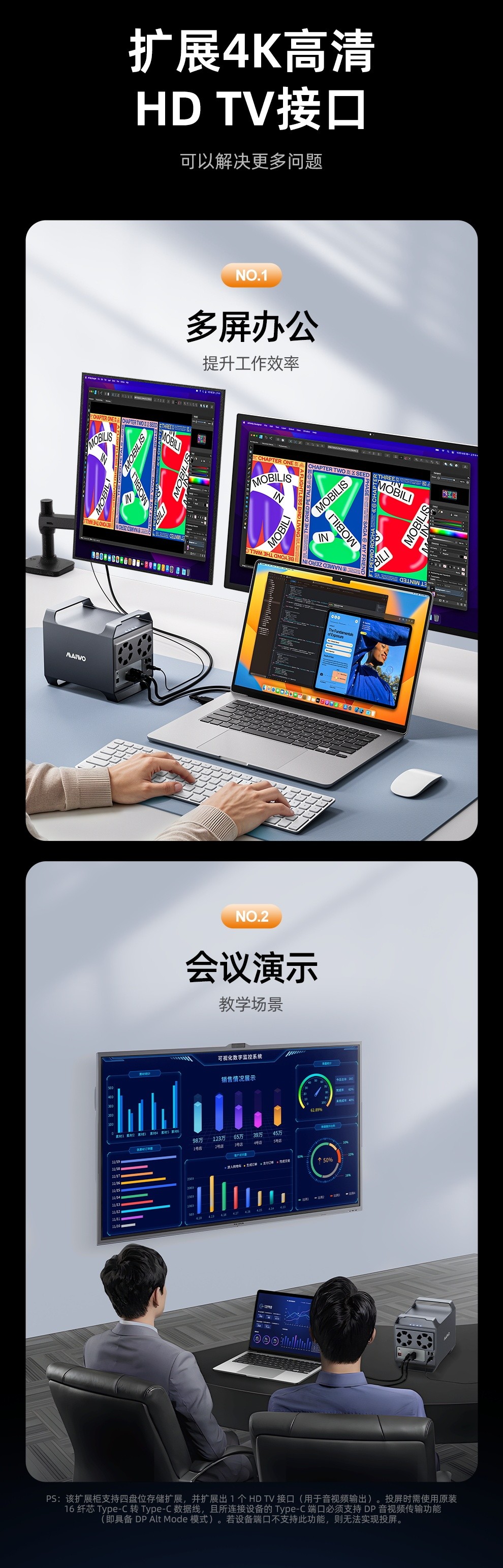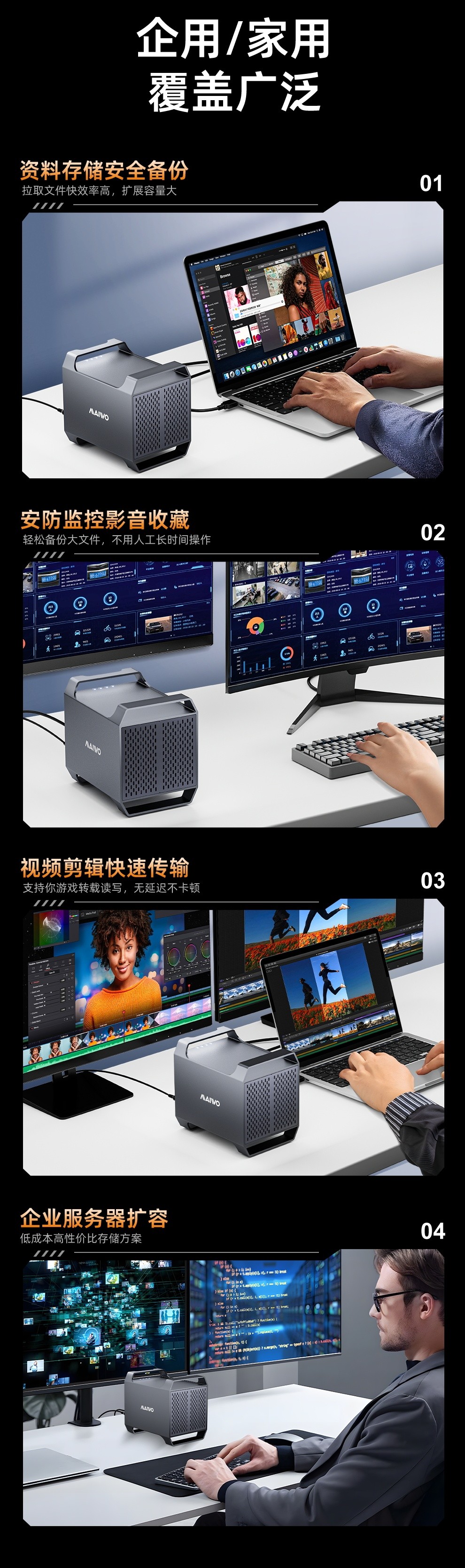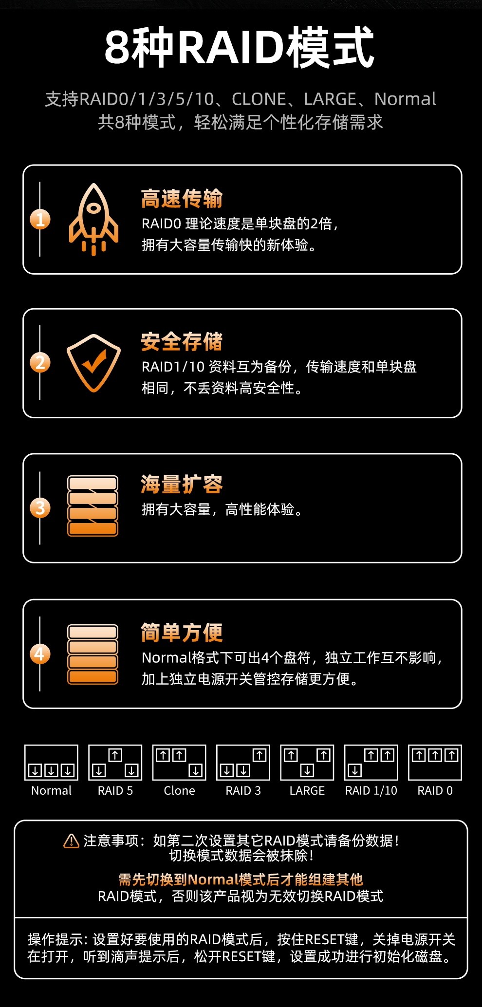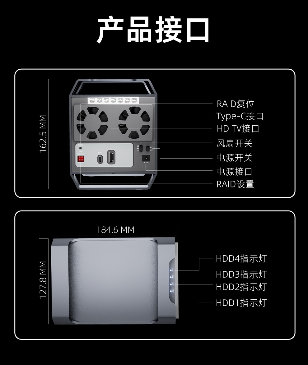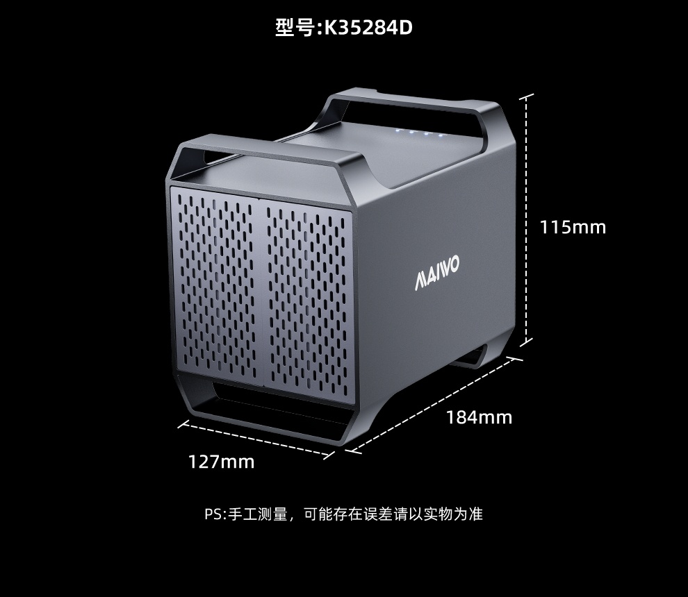 包装清单:四盘位硬盘阵列柜*1,螺丝刀*1+螺丝,12V/7A电源适配器*1,产品包装盒*1,USB3.0转Type-C线*1,Type-C转Type-C线*1,产品说明书*1,产品保修卡*1