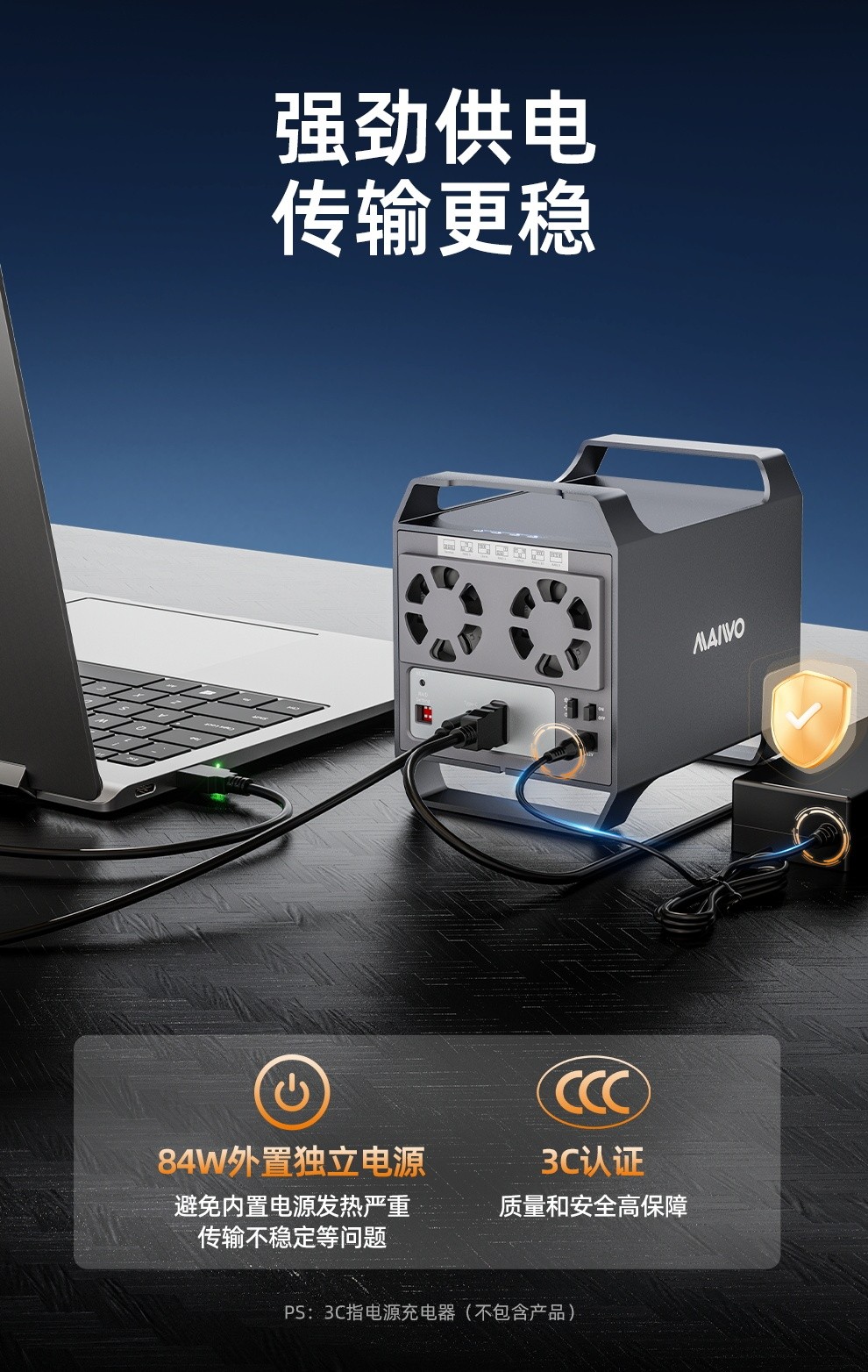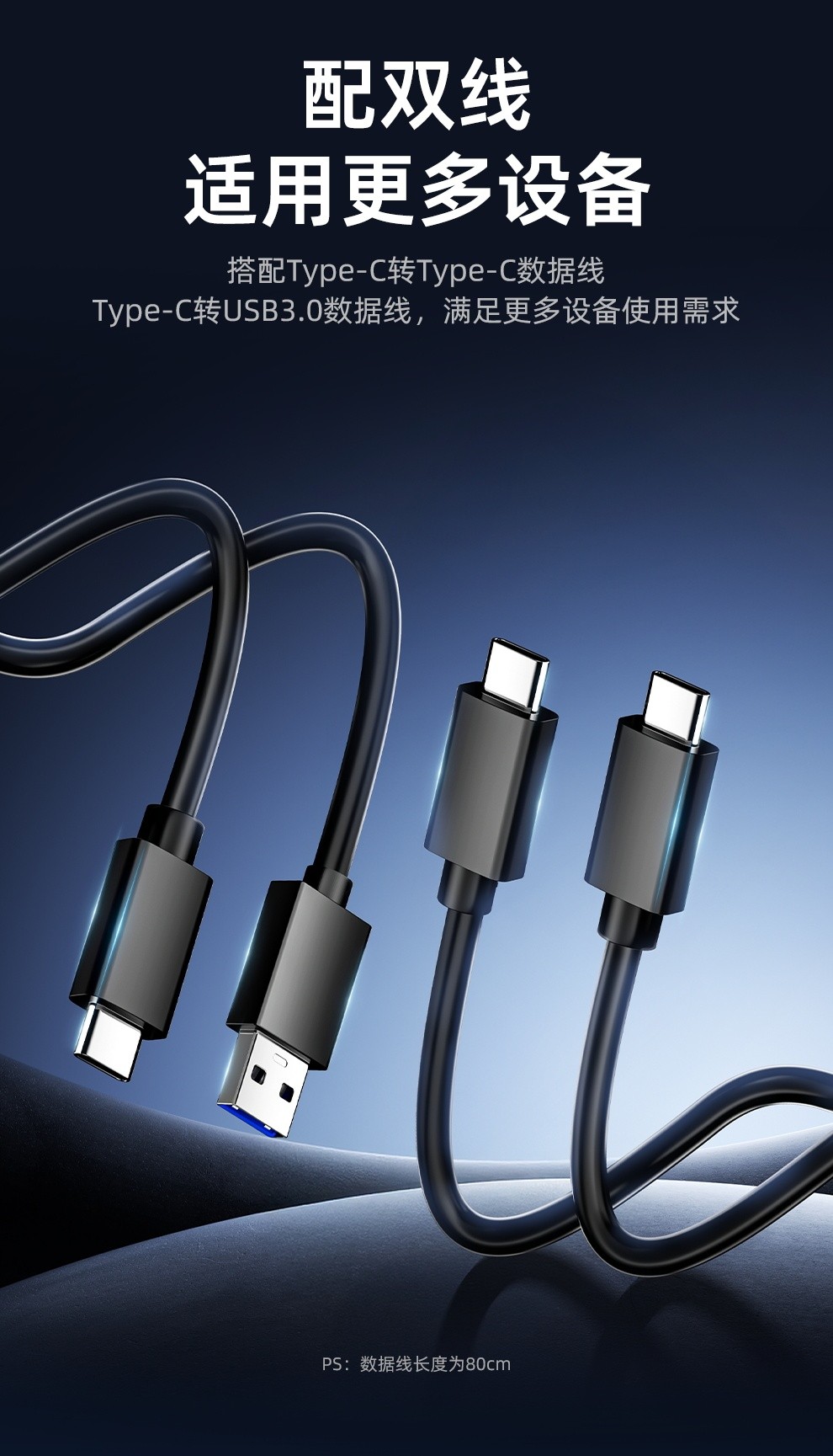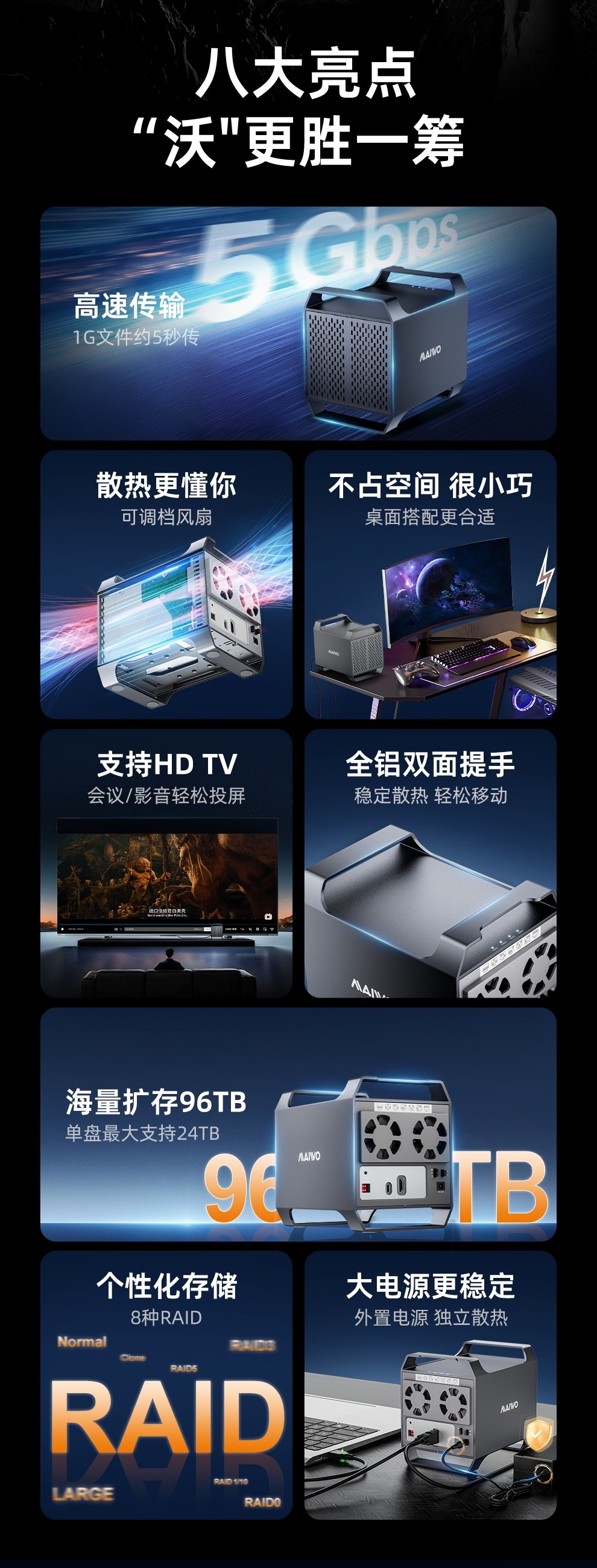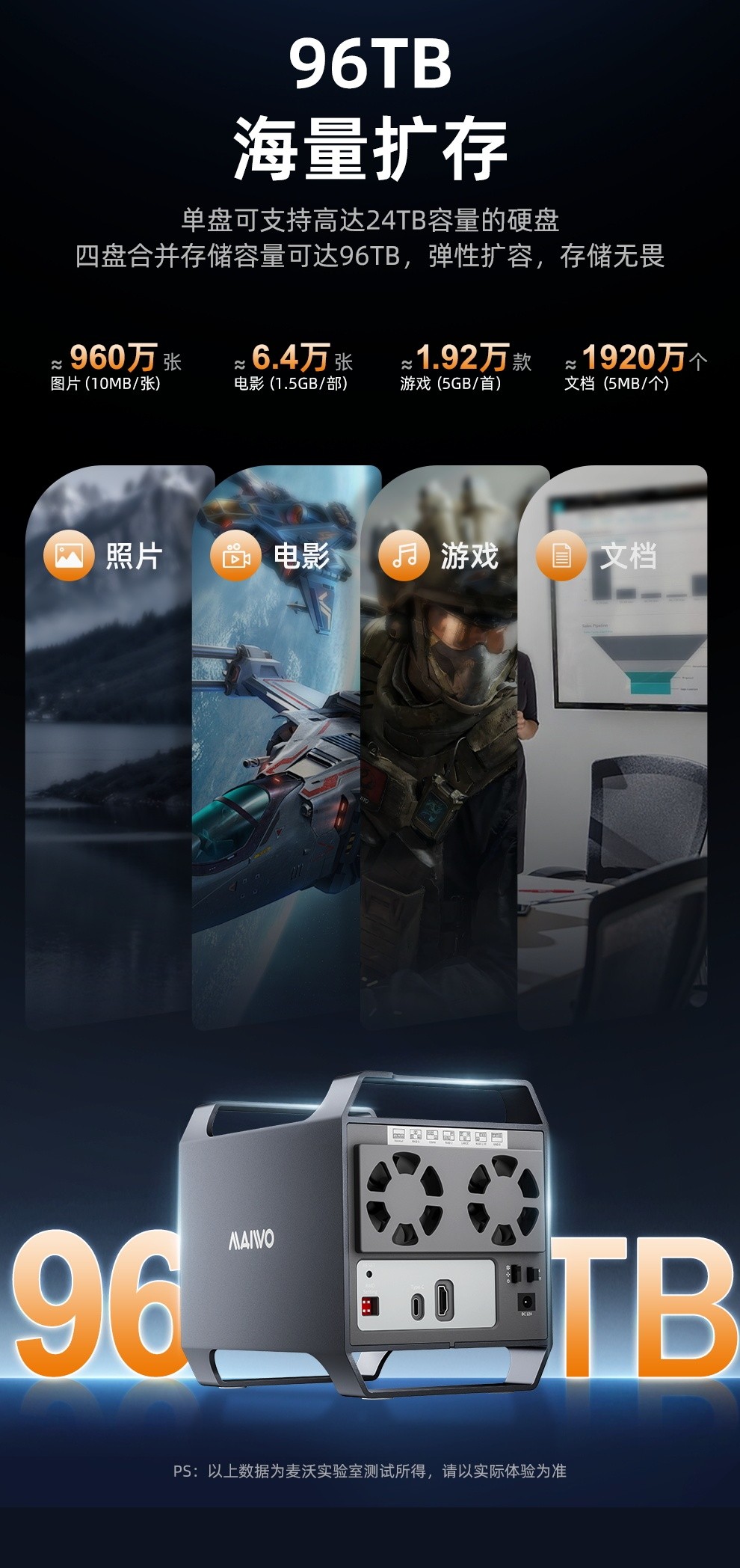 包装清单:四盘位硬盘阵列柜*1,螺丝刀*1+螺丝,12V/7A电源适配器*1,产品包装盒*1,USB3.0转Type-C线*1,Type-C转Type-C线*1,产品说明书*1,产品保修卡*1