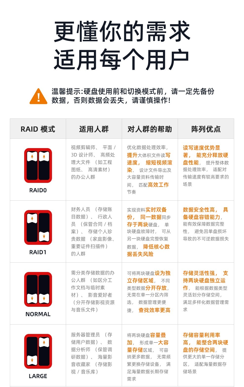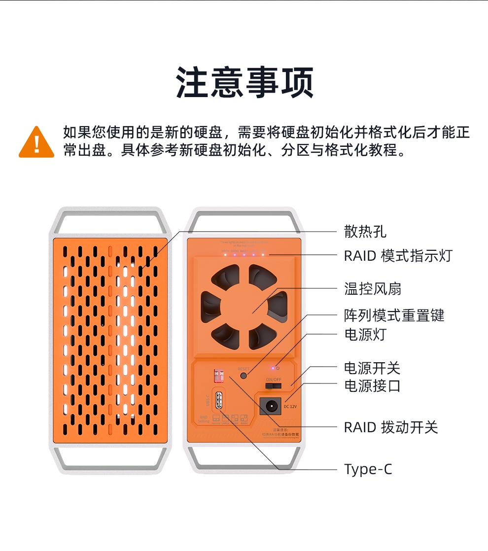 双盘位硬盘阵列柜*1,螺丝刀*1+螺丝,12V/4A电源适配器*1,产品包装盒*1,Type-C转Type-C+USB A线*1,产品说明书*1,产品保修卡*1
