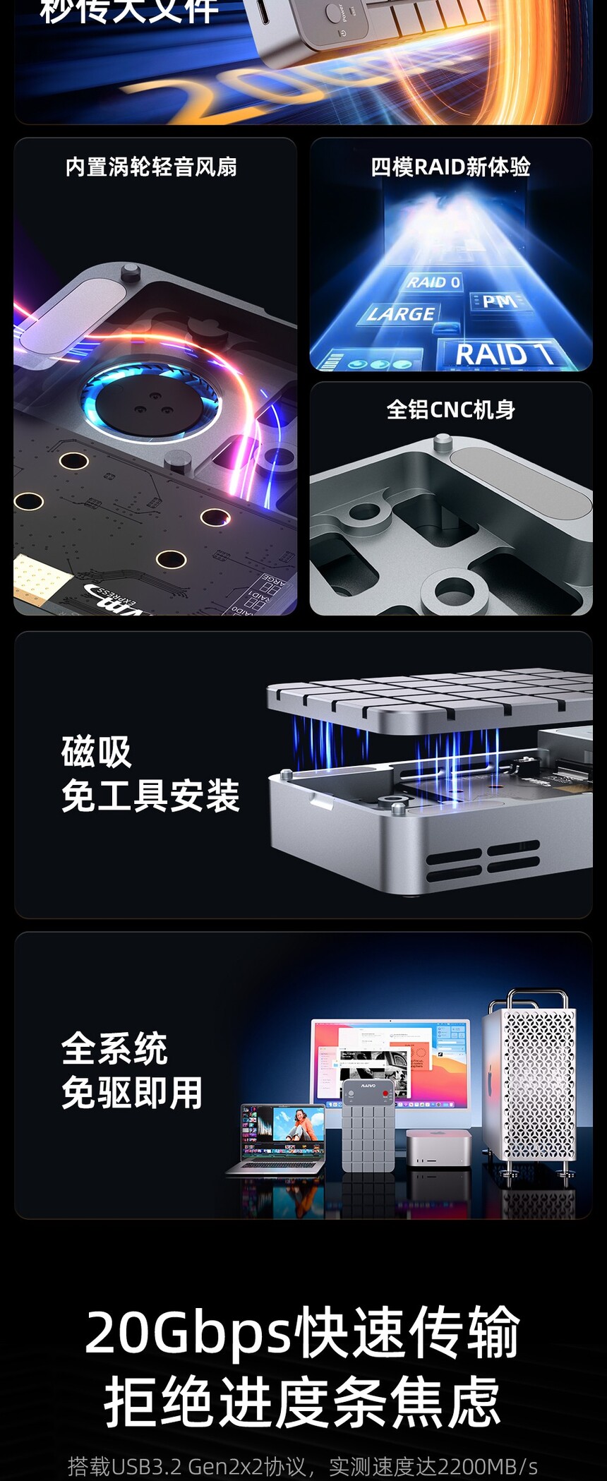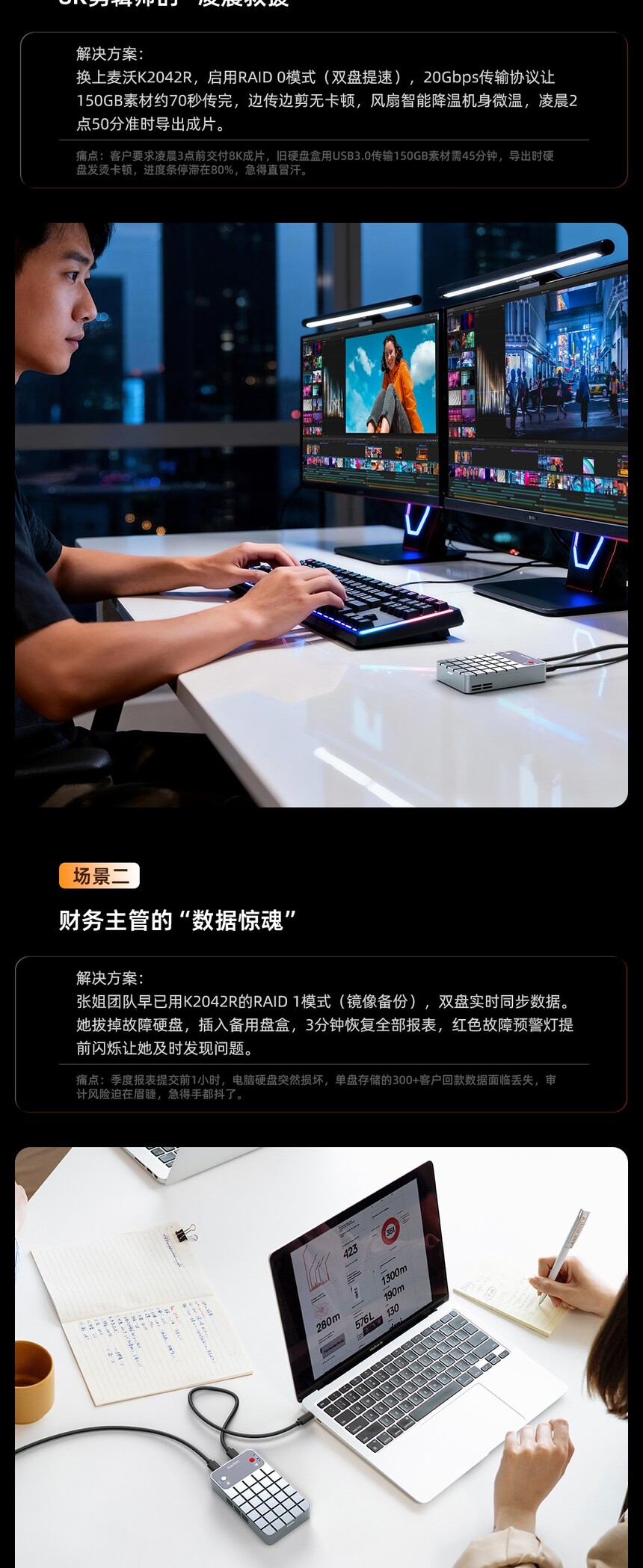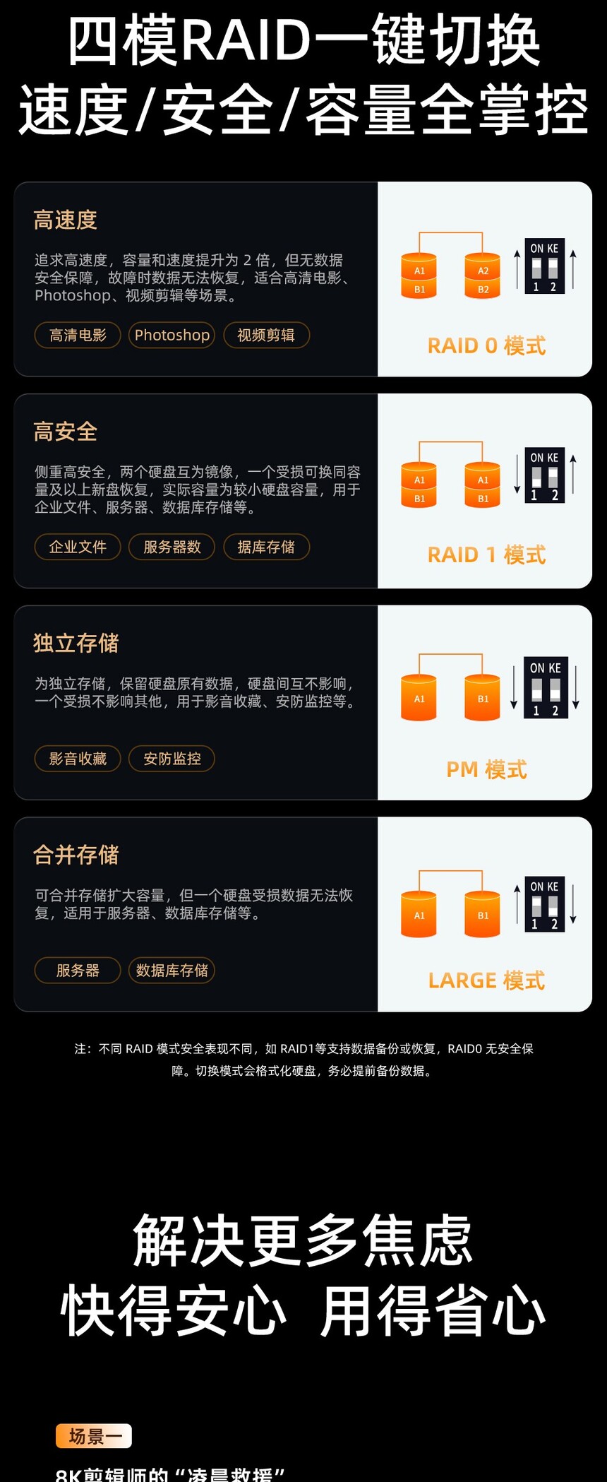 产品功能:组建阵列模式剪辑/集中素材/资料备份,还可为电脑/游戏机/电视/NAS/服务器进行扩容读写;