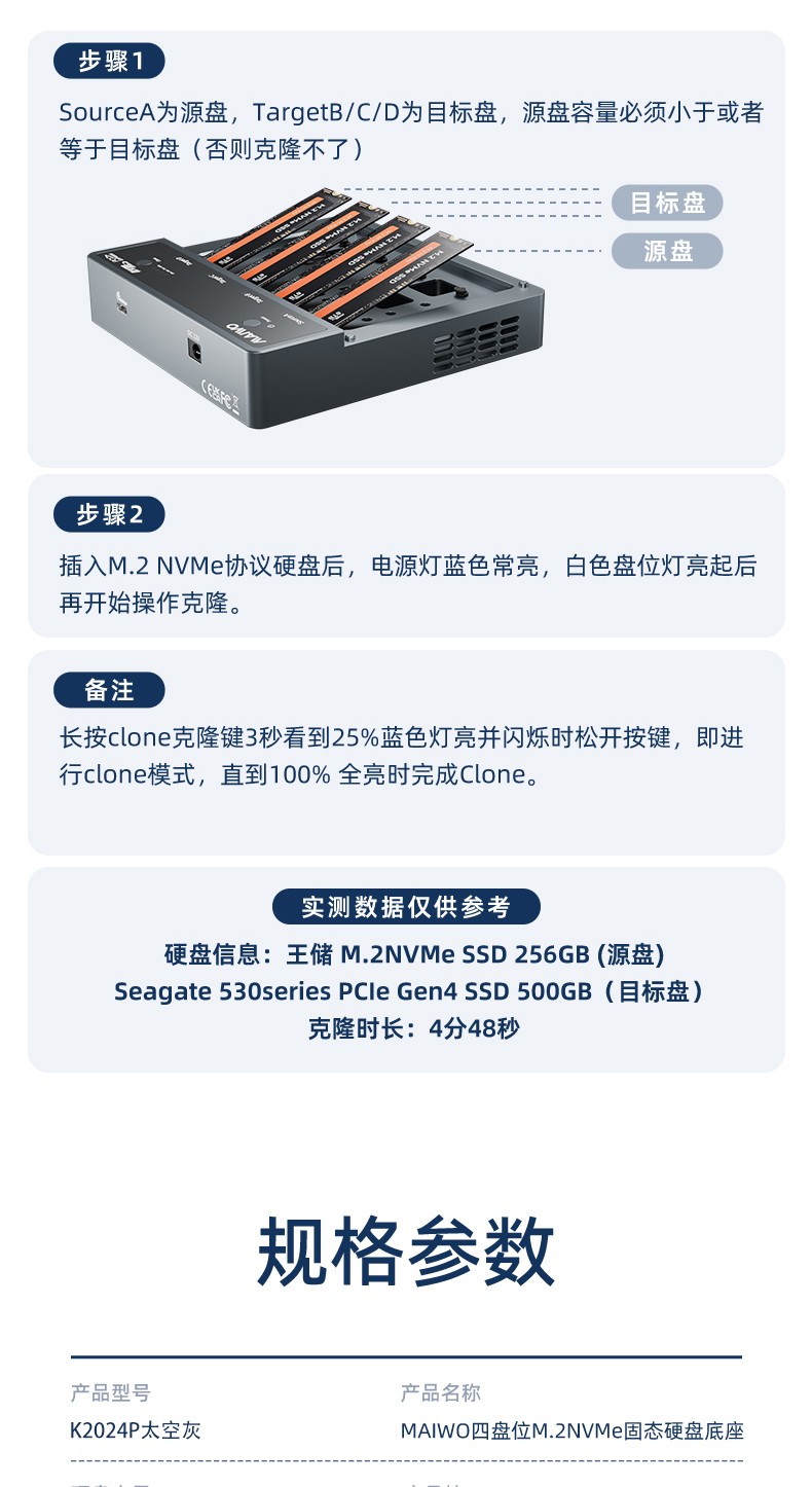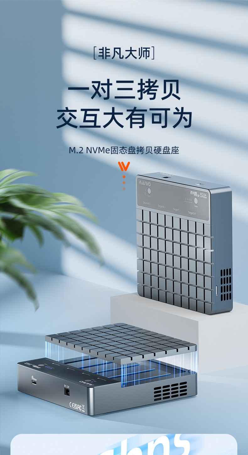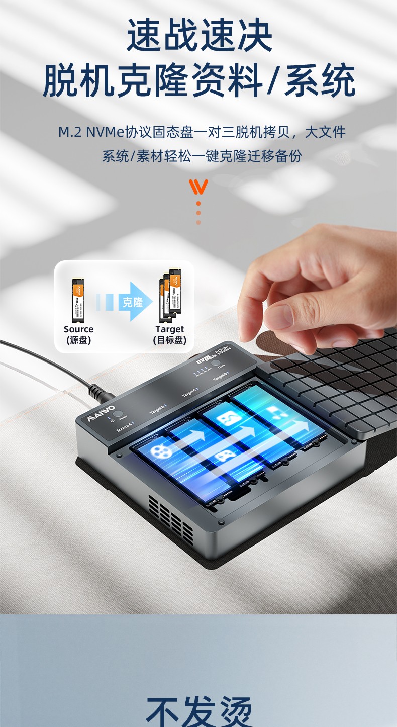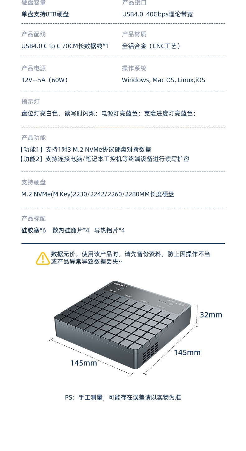 产品功能:【功能1】支持1对3 M.2 NVMe协议硬盘对拷数据 【功能2】支持连接电脑/笔记本工控机等终端设备进行读写扩容