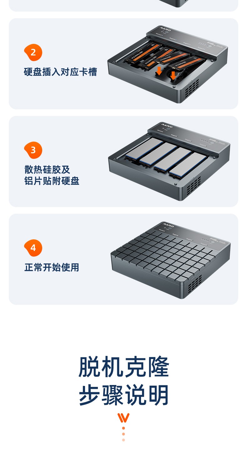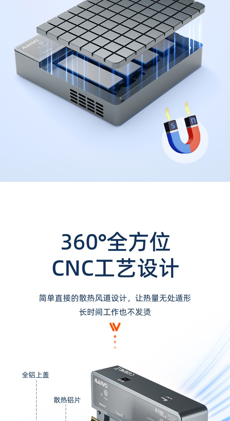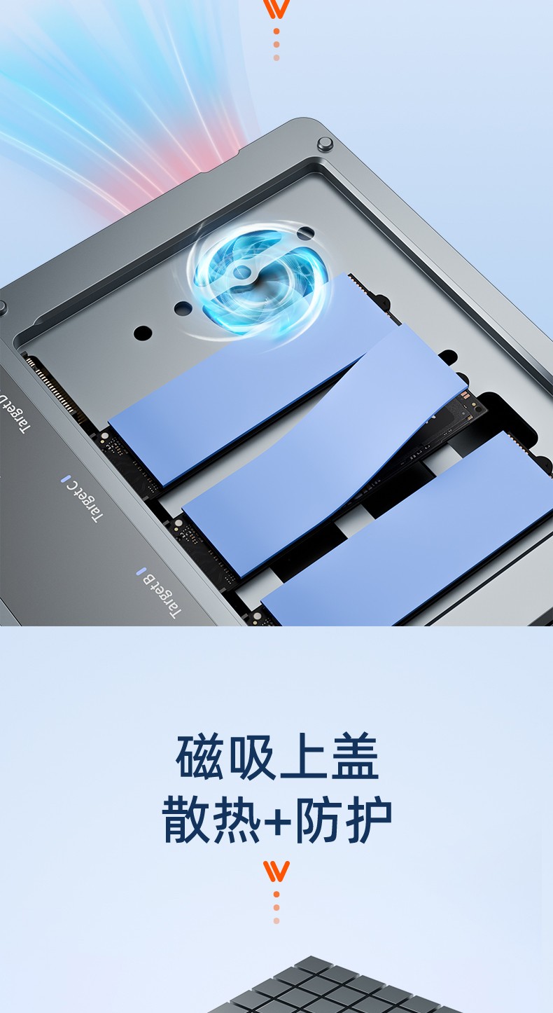 产品功能:【功能1】支持1对3 M.2 NVMe协议硬盘对拷数据 【功能2】支持连接电脑/笔记本工控机等终端设备进行读写扩容