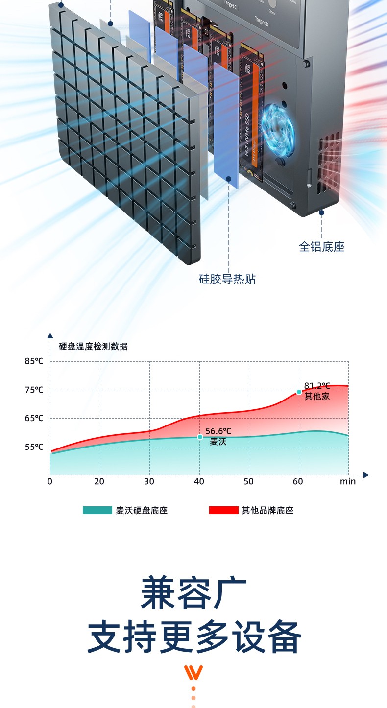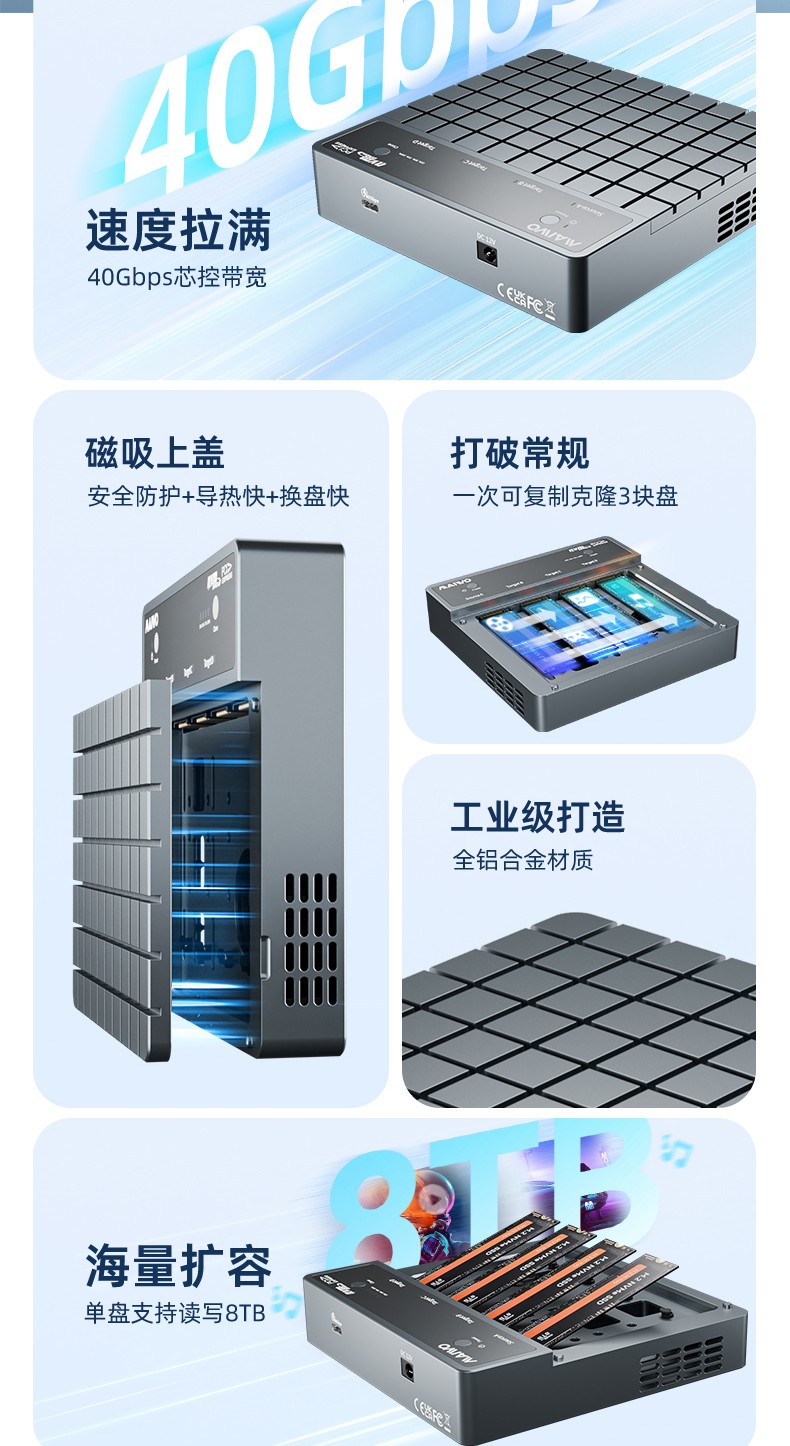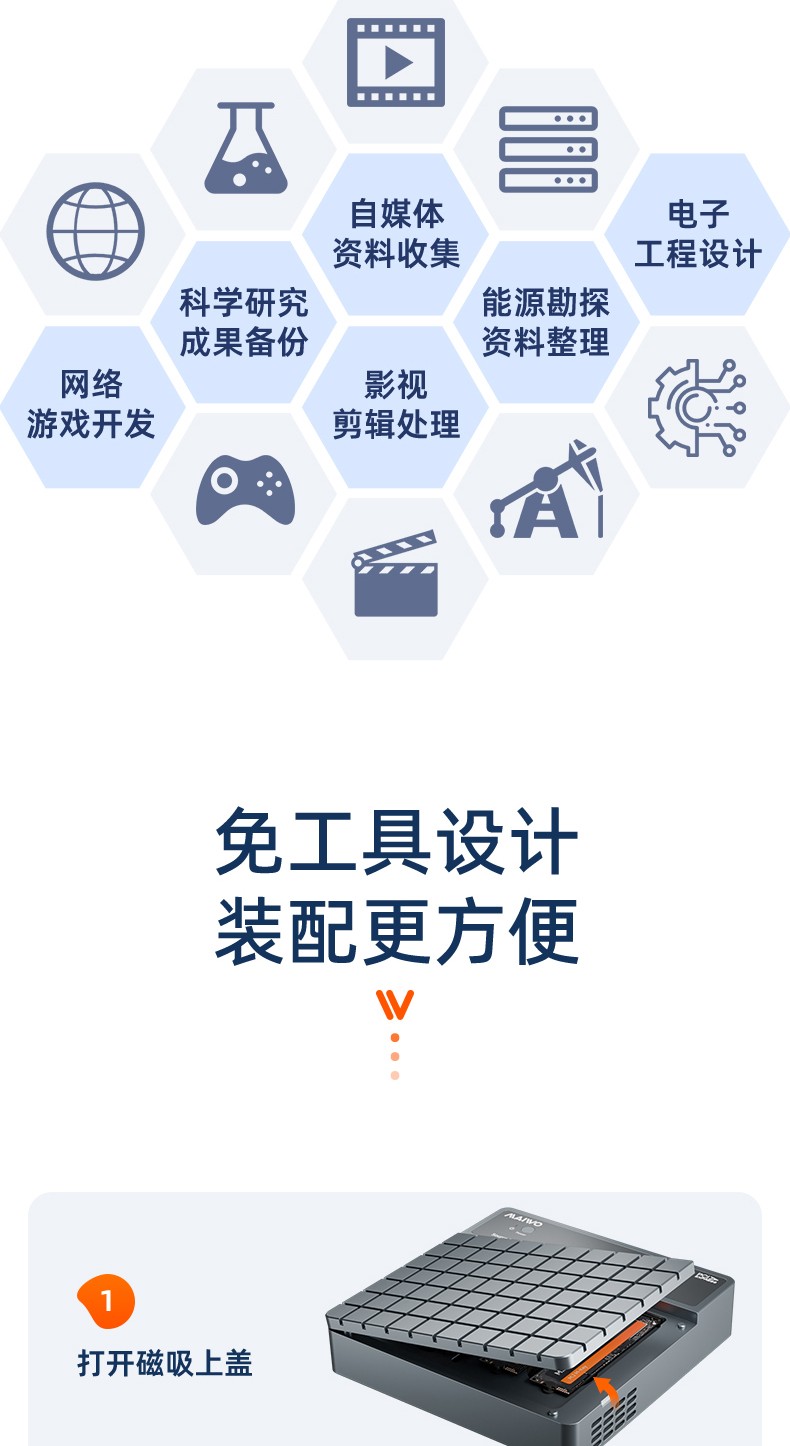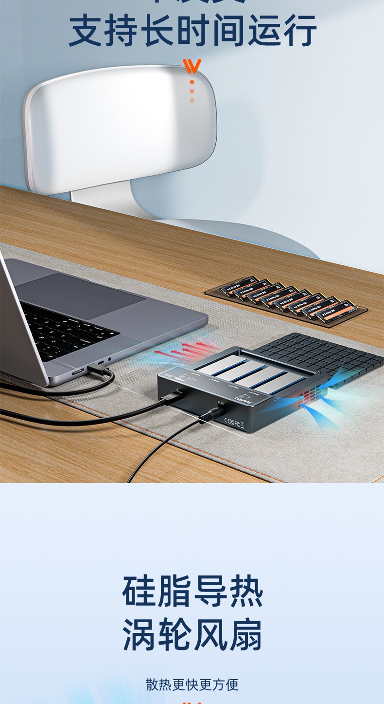产品功能:【功能1】支持1对3 M.2 NVMe协议硬盘对拷数据 【功能2】支持连接电脑/笔记本工控机等终端设备进行读写扩容