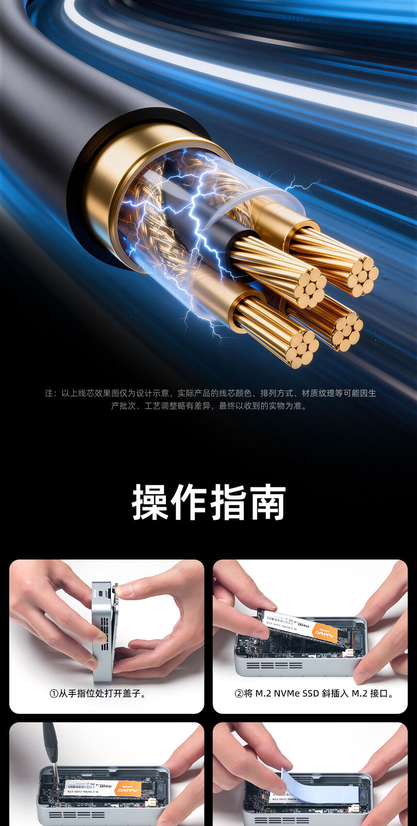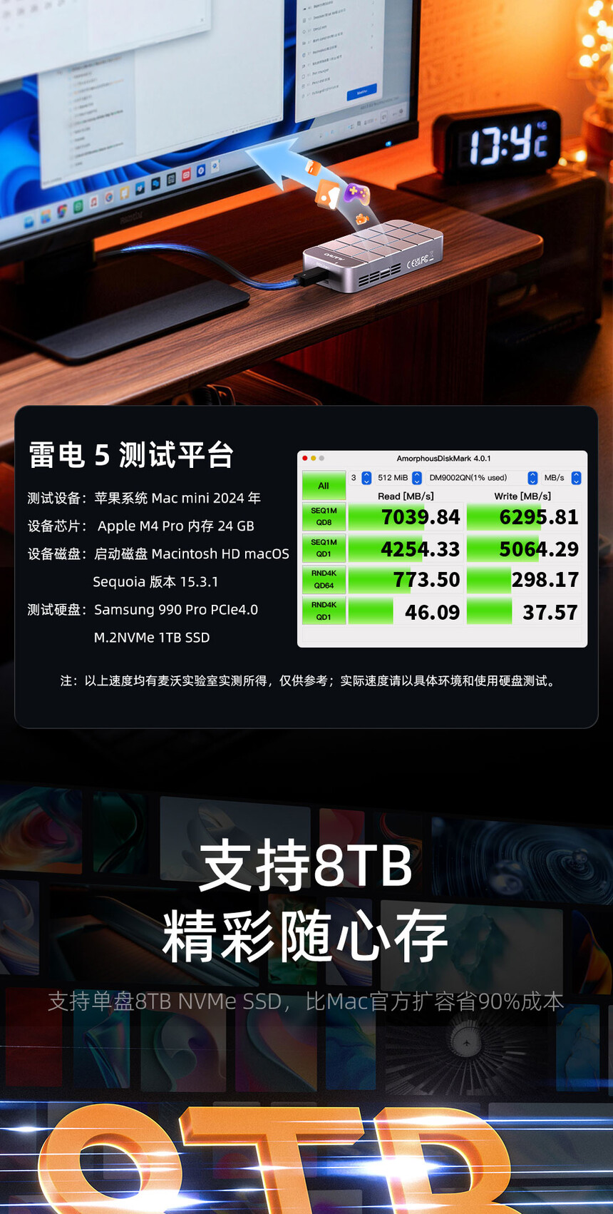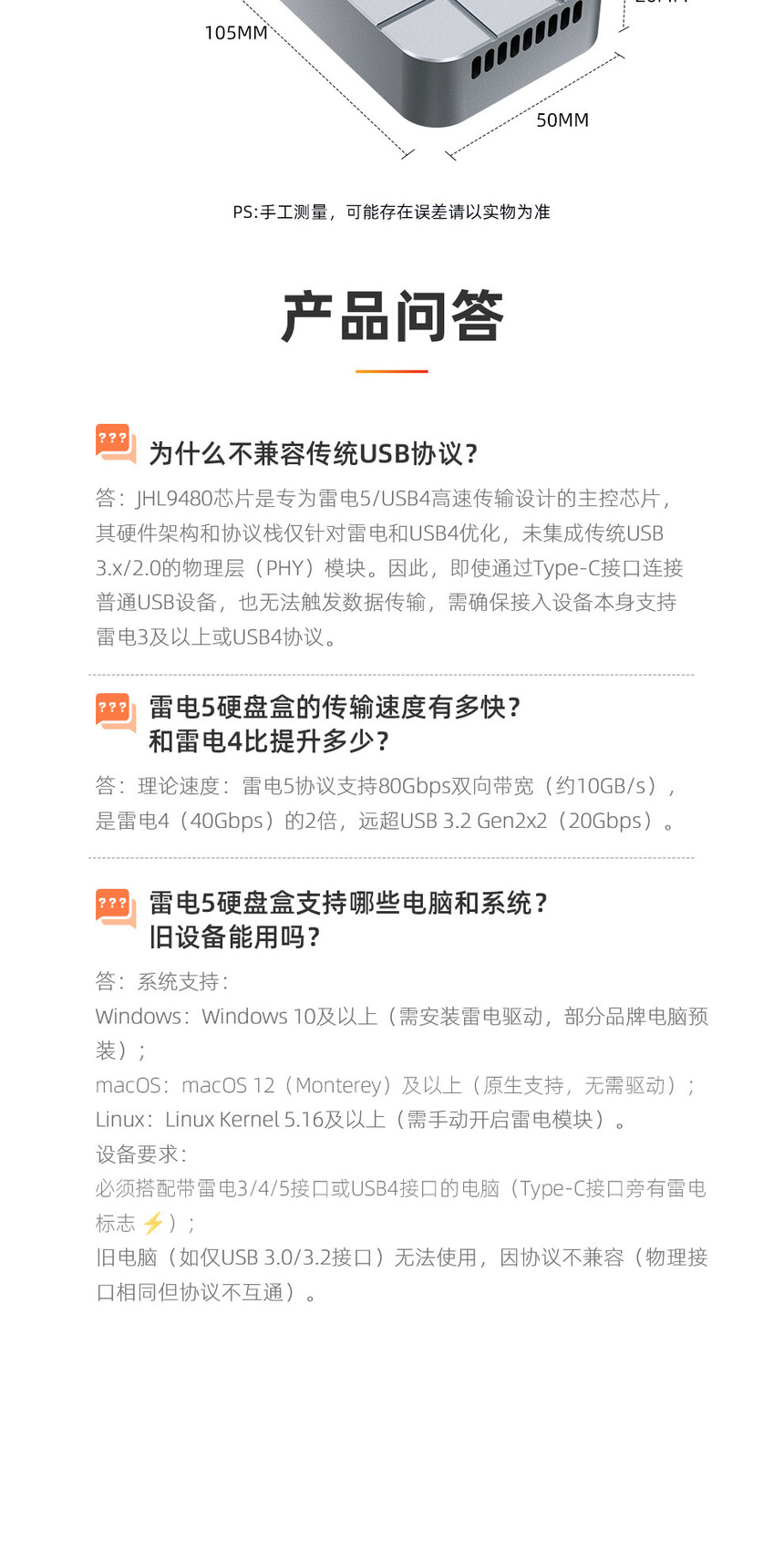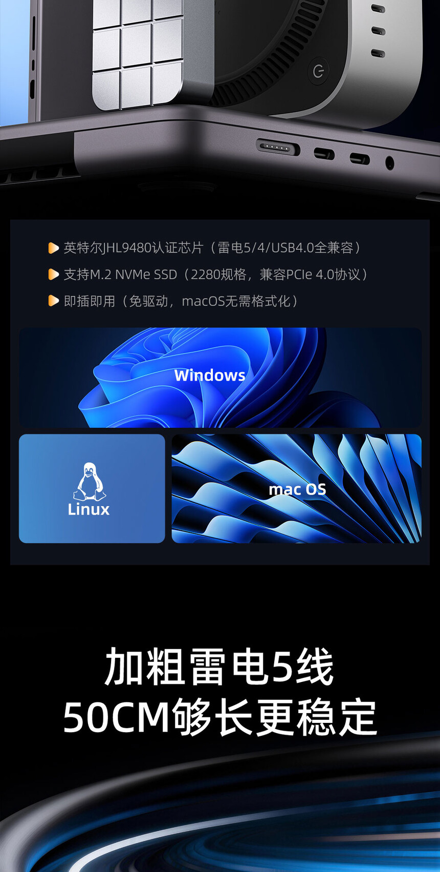 传输接口:兼容雷电5/4/3/USB4.0(不兼容USB3.2/3.1/3.0/2.0)支持硬盘:M.2 NVMe