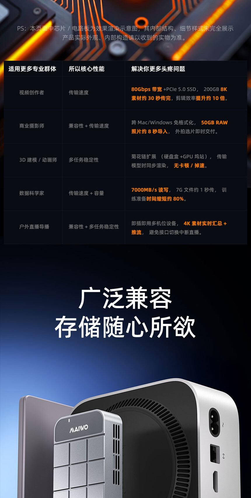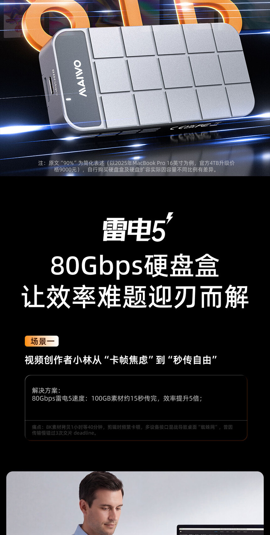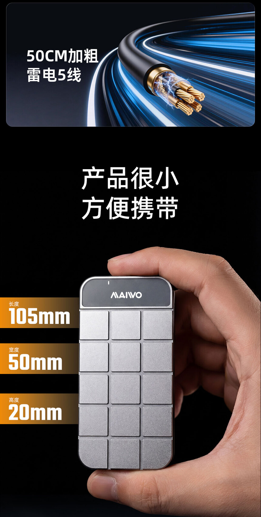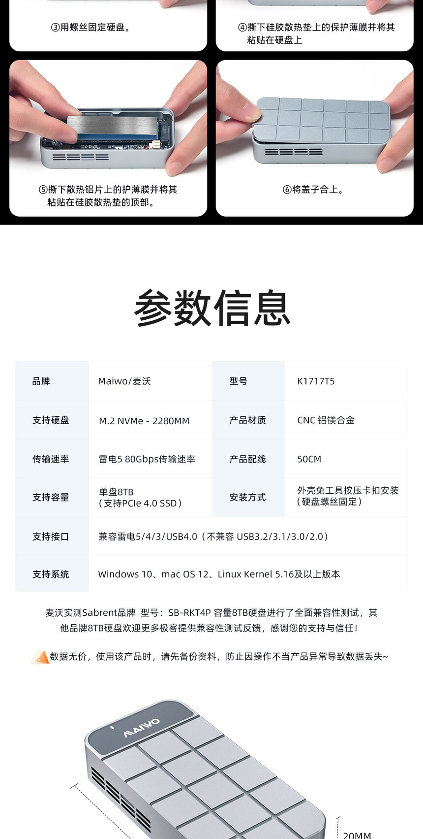 传输接口:兼容雷电5/4/3/USB4.0(不兼容USB3.2/3.1/3.0/2.0)支持硬盘:M.2 NVMe