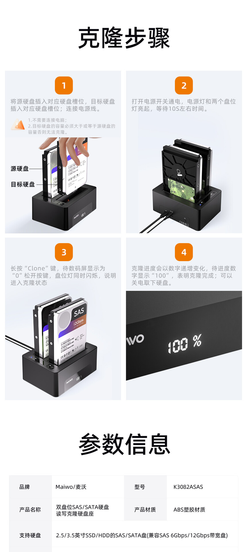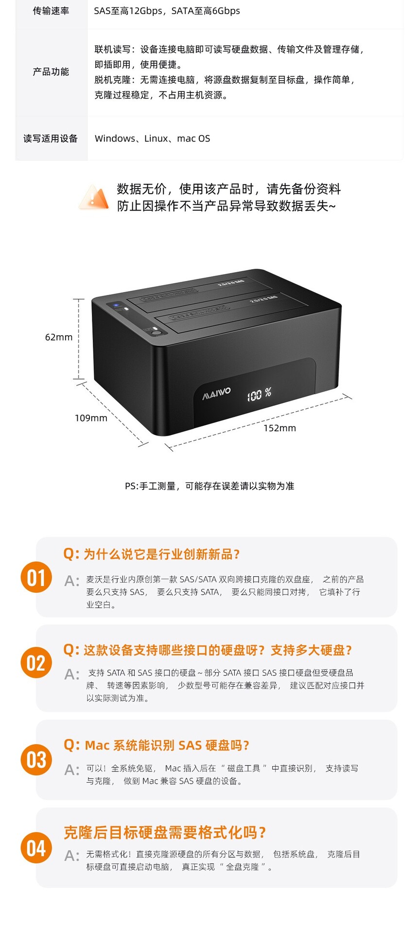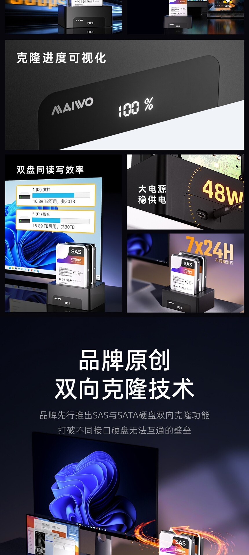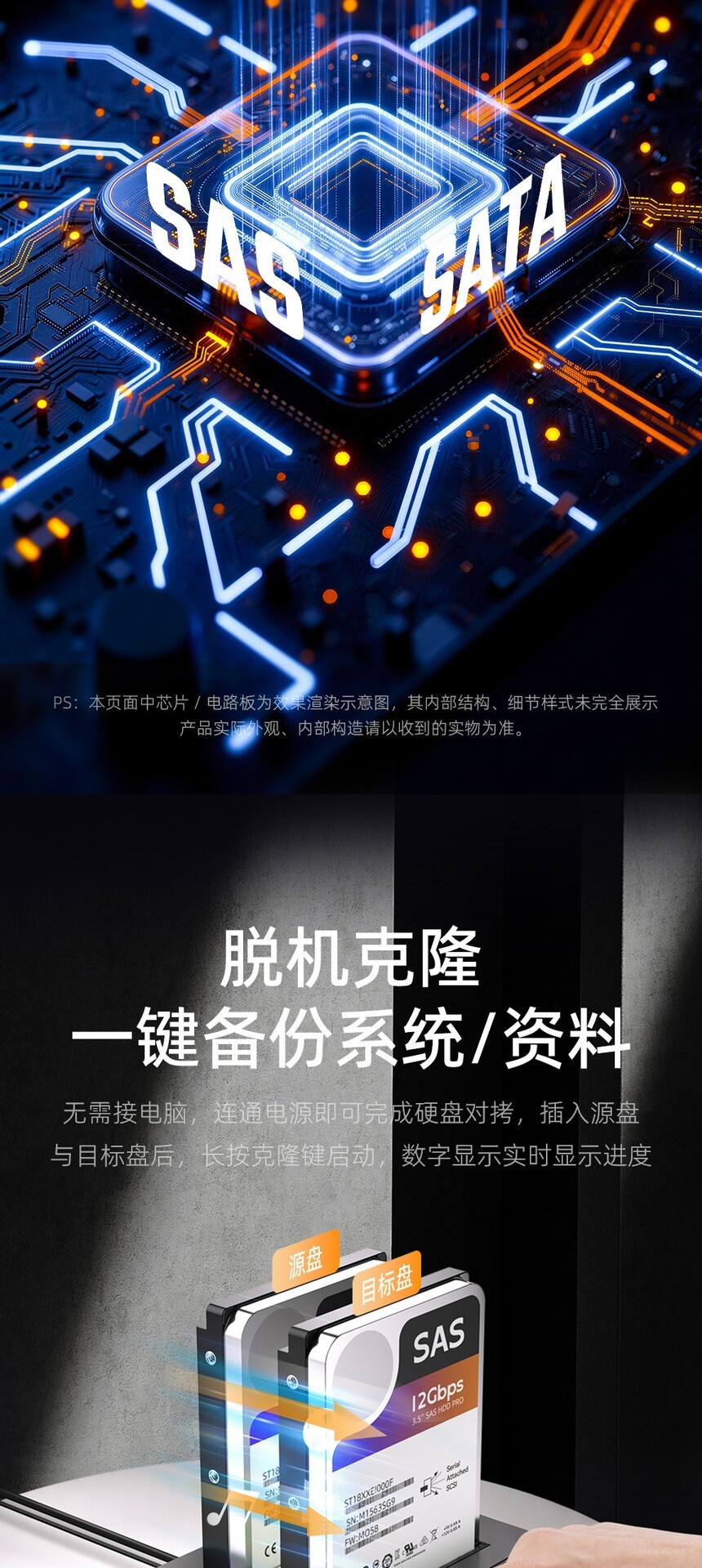 产品功能:联机读写:设备连接电脑即可读写硬盘数据、传输文件及管理存储,即插即用,使用便捷。脱机克隆:无需连接电脑,将源盘数据复制至目标盘,操作简单,克隆过程稳定,不占用主机资源。